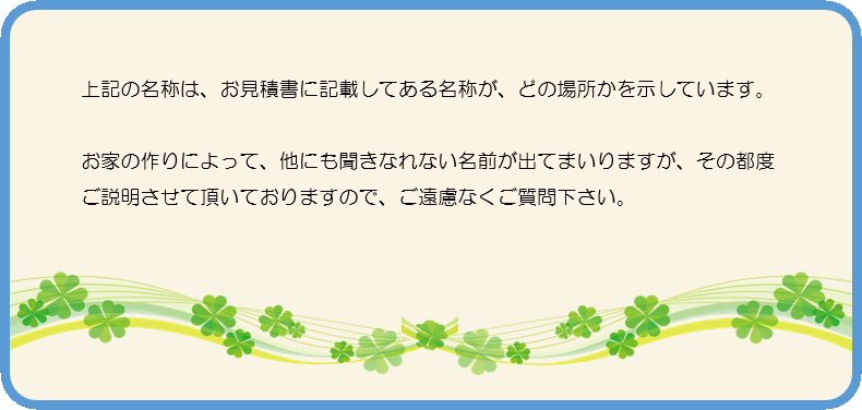 HOME | 施工前の流れ | 施工の流れ | お家の名称 | 施 工 事 例 | お問い合せ |